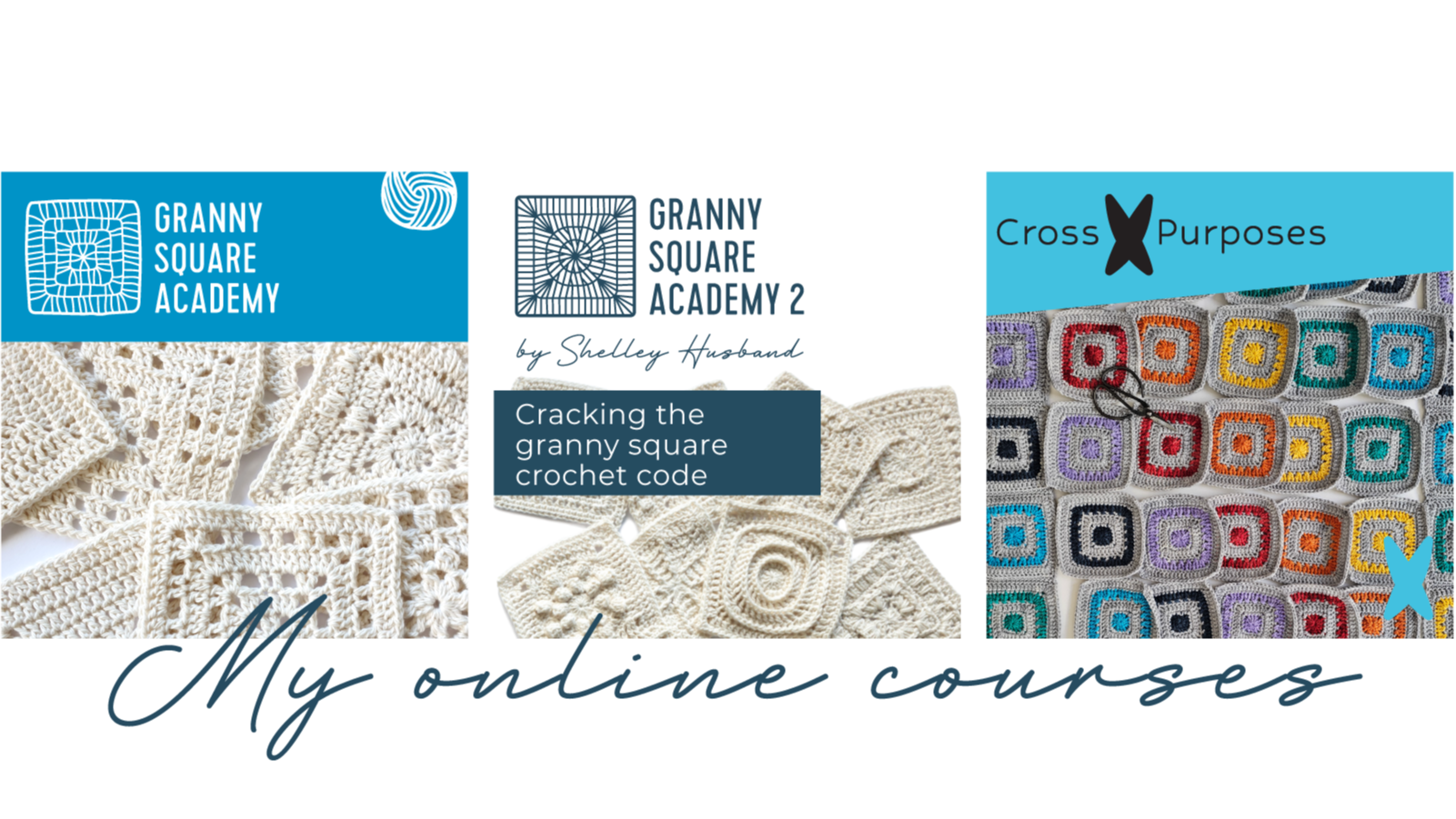 I love nothing more than teaching granny square crochet, and my online courses are designed to take you step by step through the advernture. Both Granny Square Academy 1 and Granny Square Academy 2 teach you the intricacies of granny square crochet with oh so much support. Cross Purposes teaches you planning granny square crochet projects skills.Â